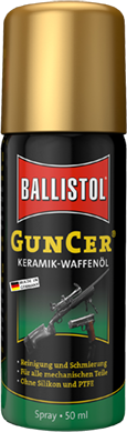 GunCer – Waffentuning mit Keramik-Additiv. Das Hochleistungs-Öl für Präzisionsschützen, Jäger und "Law Enforcement". Das besondere Keramik-Additiv stellt die Funktionsleistung und Schussgenauigkeit auch im Extrembereich sicher, zusätzlich vermindert es den Waffenverschleiß. Einsetzbar von –40 °C bis +210 °C. Notlaufschmierung sogar bis über +1000 °C. Ausgezeichneter Korrosionsschutz, wasserbeständig. Ohne Zusätze von Silikon und PTFE, kein Verharzen.