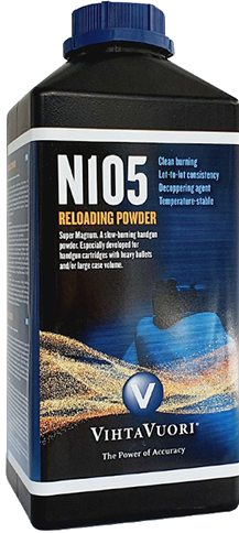Zwischen dem N 350 und dem N 110 klafft eine Lücke im Abbrandverhalten. In manchen Patronen wird die Gasdruckgrenze erreicht, ohne dass die Kapazität der Hülse ausgeschöpft wird, während das N 110 bereits zu langsam ist, um auf die volle Leistung der Patrone zu kommen. Um diese Lücke zu schließen, wurde das N 105 entwickelt. Die Abbrandgeschwindigkeit liegt zwischen den beiden erwähnten Pulvern. Das N 105 ist die erste Wahl bei Kalibern mit schweren Geschossen und/oder großem Hülsenvolumen wie .357 Mag., 10 mm Auto, .40 S&W, .44 Mag. und .45 Magnum.